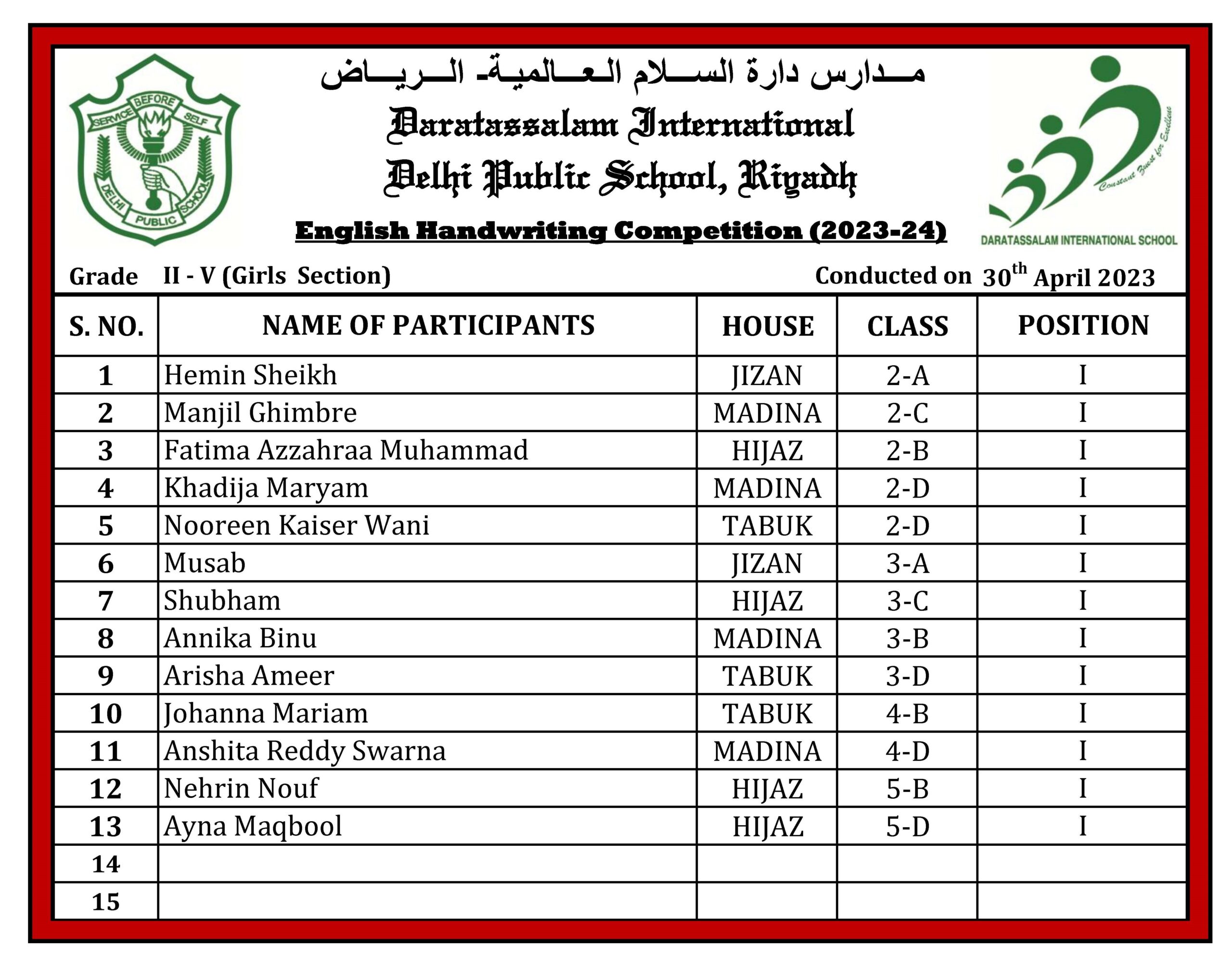“Daratassalam International, Delhi Public School”, is one of the best dynamic and progressive educational institutions in the entire KSA. It offers a broad range of academic programmes with a strong emphasis on English Communication, Mathematics, Art and Sciences. Most of the students outshine bringing laurels to the school for their public speaking skills, both premeditative and impromptu speeches.